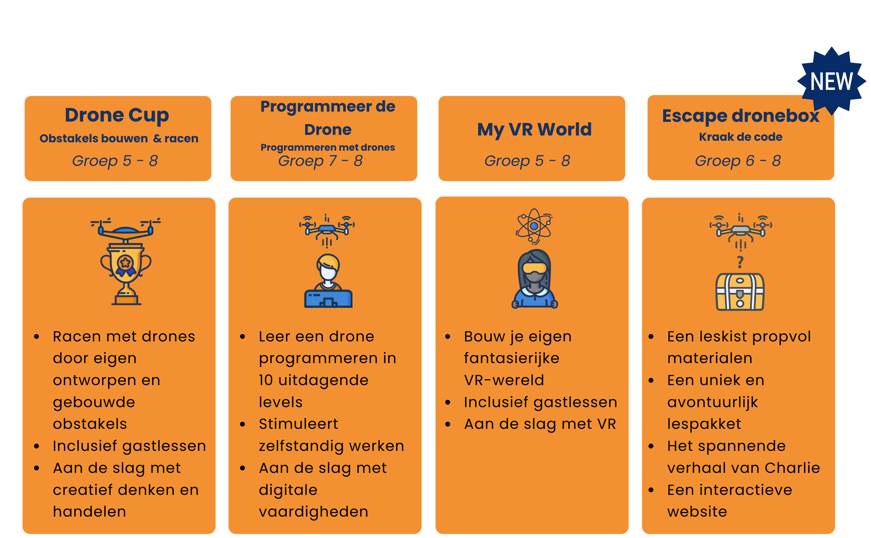 Techniek als drones, VR en robots zien wij als hét middel om basisschoolleerlingen vaardigheden bij te brengen die zij nodig hebben in een wereld die sneller verandert dan ooit. We laten leerlingen kennismaken met deze game changing technieken door de geschiedenis in te duiken en een vooruitblik te geven. Zo creëren we een contextrijke leeromgeving om aan de slag te gaan met de challenge: drone vliegen en obstakels bouwen in onze lesmodules.