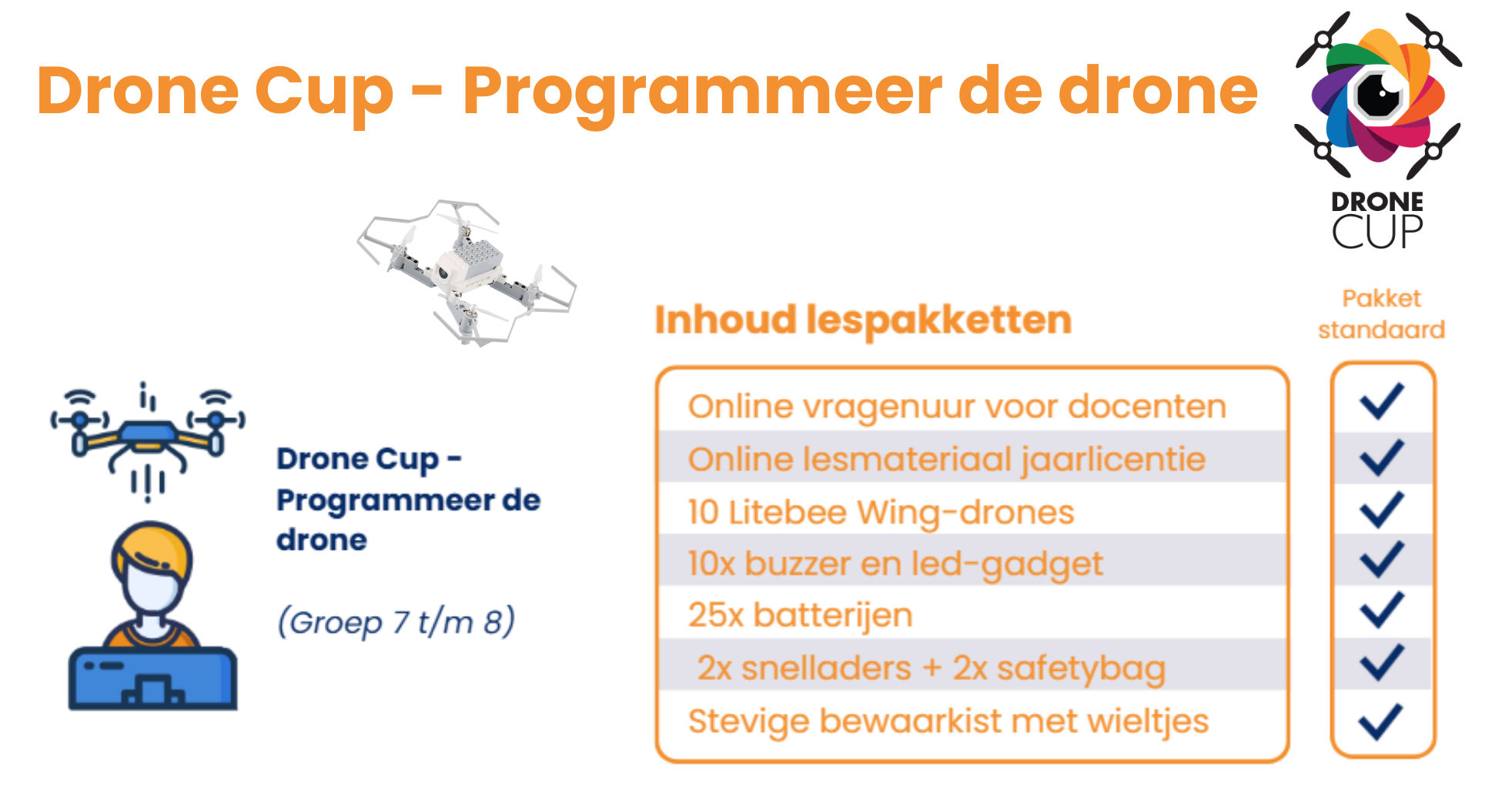 De leerlingen leren in de module programmeer de drone, de basisprincipes van het blok-programmeren zoals herhaling, debuggen etc. Op deze manier krijgen de leerlingen echt inzicht in wat programmeren inhoud. Ze gaan zelfstandig in kleine groepjes aan de slag met het programmeren van een LiteBee Wing Drone!